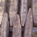 aus schweren Bohlen. Auf einem Pfosten auf dem Weg davor meine ich Reste von
