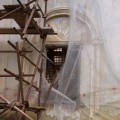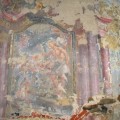 Decke fehlt, man sieht hinauf ins löchrige Dach. Diese Kirche scheint in den
