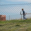 Einige Tschechen machen Heu mit Gabel und Rechen. Ein anderer mäht Gras mit